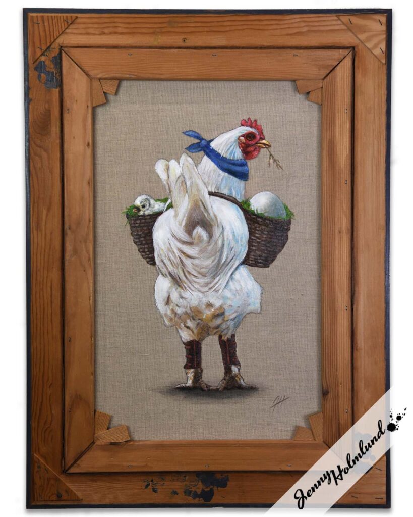 Hen carrying chicken and egg on the back of an old painting by Jenny Holmlund